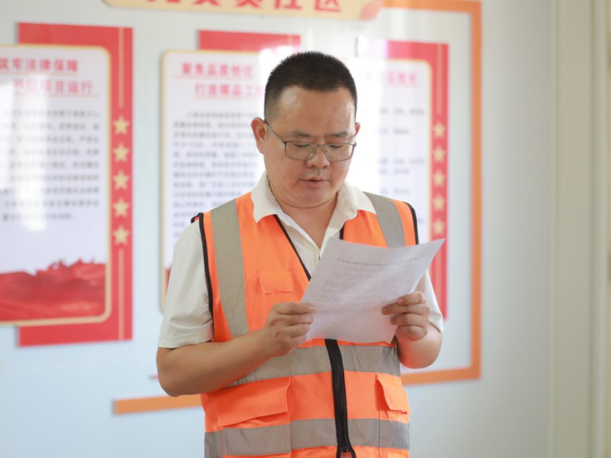 隨后,建工集團機關(guān)黨支部開展“能工巧匠”黨建品牌活動,學(xué)習(xí)宣貫了清廉項目清風(fēng)工匠行動、青年突擊攻堅工匠行動和提質(zhì)增效創(chuàng)優(yōu)工匠行動實施方案。王鵬同志帶領(lǐng)全體黨員宣讀了廉潔從業(yè)誓詞,崔巍同志和呂成芳同志分別為項目廉潔監(jiān)督員頒發(fā)聘書,廉潔監(jiān)督員代表作了履職承諾。建工集團機關(guān)支部舉行了“建工集團青年先鋒突擊隊”授旗儀式,洪登峰同志將隊旗授予青年先鋒突擊隊隊長。最后全體黨員按照黨員責(zé)任區(qū)分工檢查了項目安全、進(jìn)度、質(zhì)量、經(jīng)營、物資管理、法律風(fēng)險的情況,并與項目部深入交流,提出改進(jìn)措施和意見。